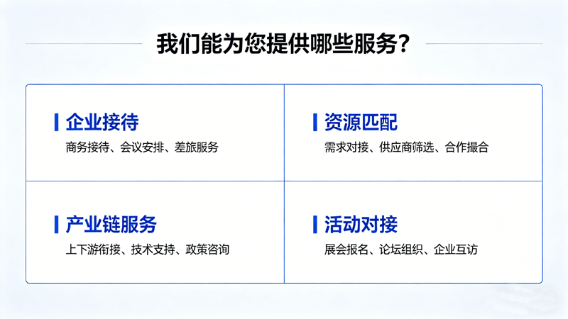 活动对接:企业座谈/园区考察参观/招商活动推介/展会对接/企业交流活动组织