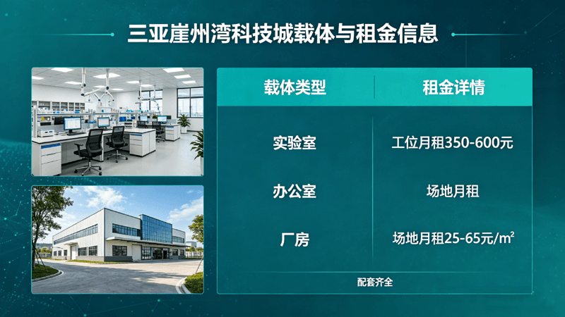 三亚崖州湾科技城高新区已建成并投入多种科研、办公载体,涵盖实验室,办公室,厂房。园区配套齐全,可满足多种产业类型、不同发展阶段、不同规模的企业及科研机构的办公、科研及产业化空间载体需求,工位租金约350-600元/个/月,场地租金约25-65元/㎡/月。