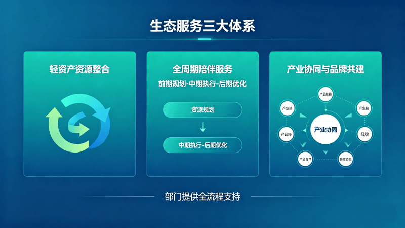 首先生态服务的含义,是指公司以轻资产运营能力为核心,依托信息化、数字化、智能化技术,整合园区产业招商、“城小二”等多元伙伴与资源,打造覆盖全产业链、全生命周期、圈层科技的三大服务体系,深度嵌入园区孵化培育与产业协同两大发展中心,为市场化客户提供一站式解决方案,持续提升资产价值与产业集聚度;通过塑造并聚合品牌亮点,构建智慧化品牌推广矩阵,强化生态赋能,发掘行业潜在机会,最终实现园区、企业与运营商三方共同成长。